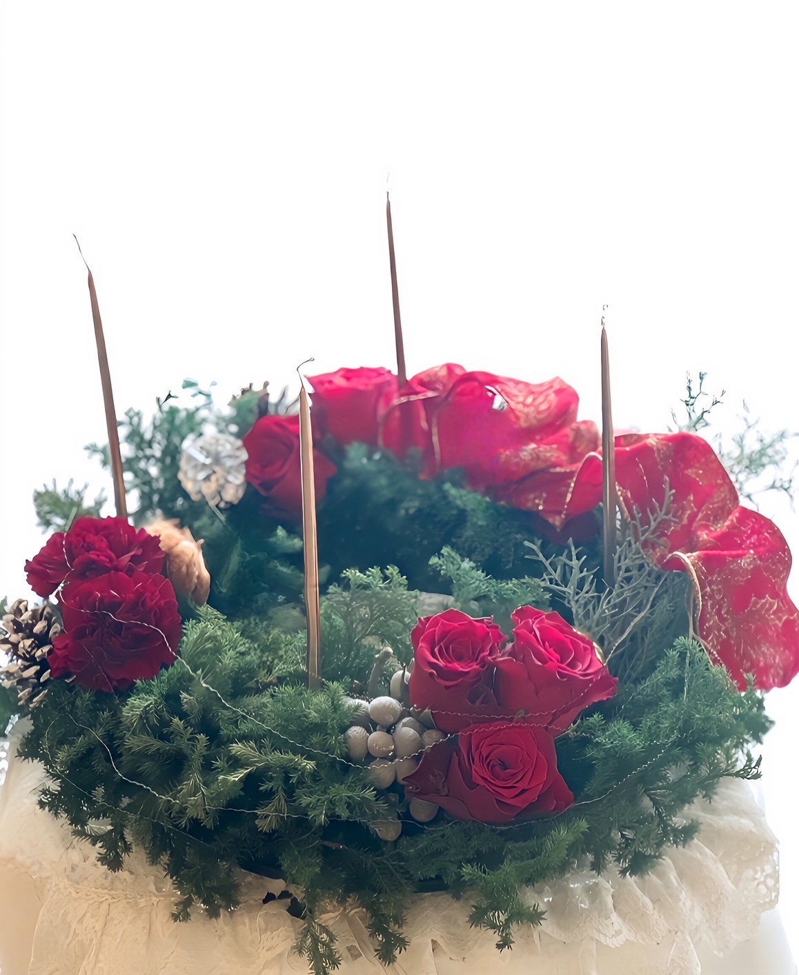 東京フラワーアレンジメントスクールエミフラワーサロン大澤恵美です。12月はクリスマスキャンドルリースをレッスンしております。体験レッスンは初級コースと同じ作品を1980円で体験!大変お得なになっております。こちらは去年の上級コース作品になりますが、今年はホワイトリースになります。体験レッスンお待ちしております。