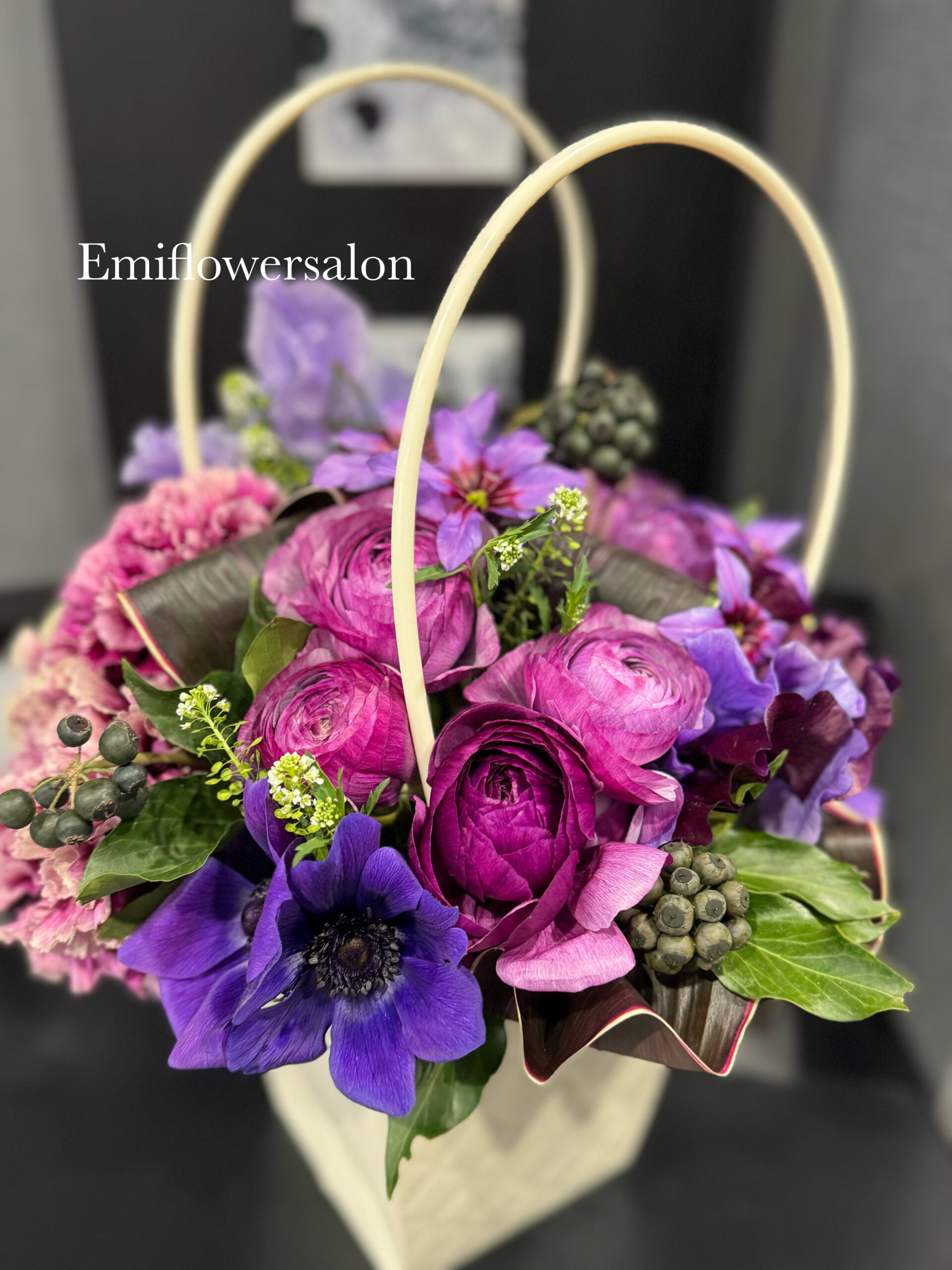 エミフラワーサロン大澤恵美です。1月はパープルのグラデーションのフラワーアレンジメントでした。